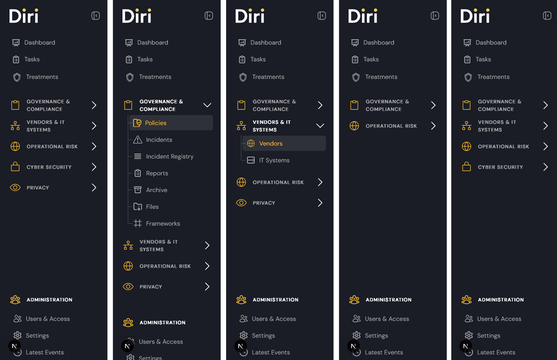 In short, we are finalizing the Governance & Compliance module. Significant changes brings the introduction of the Policies -feature which allows for policies, guidelines, routines, etc. to be created and shared in Diri. Furthermore, we introduce the incident management feature for dealing with security incidents, non-conformities, and deviations. All existing customers will have the Governance & Compliance module enabled by default under their current subscription terms.